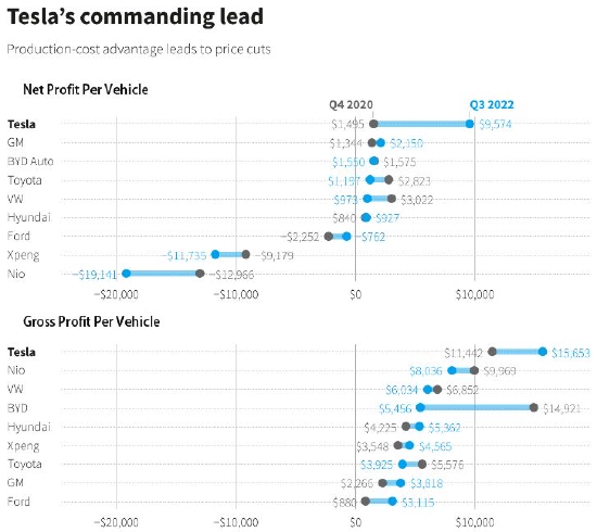特斯拉曾是汽车行业的亏损大户。然而,该公司去年每辆车的销售利润已经领先于绝大多数竞争对手。2022年第三季度,特斯拉每辆车的毛利润为15653美元,是大众汽车(17.385, 0.12, 0.67%)的两倍多,丰田汽车(146.03, -0.08, -0.05%)的四倍,福特汽车(12.8, 0.40, 3.23%)的五倍。